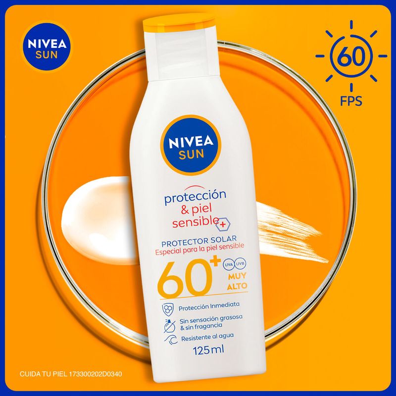 PROTECTOR SOLAR NIVEA SUN PROTECT & SENSITIVE SPF 60 FRASCO X 125 ML. Tiene una fórmula enriquecida con Vitamina E, que ayuda a minimizar el riesgo de alergias causadas por el sol en pieles sensibles, dejando la piel suave y tersa. Tiene un efectivo sistema de filtros UVA/UVB que brindan protección inmediata y ayuda a prevenir quemaduras solares y el envejecimiento prematuro de la piel. Resistente al agua.