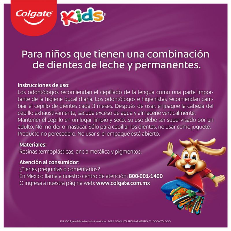 Cepillo dental Colgate kids conejo 5+ anos blister x 2 und cuenta con cerdas de diferentes alturas, limpiador de lengua & dosificador para una limpieza profunda. Ideal para los primeros pasos de salud bucal. Recomendado para niños de 5 años en adelante.