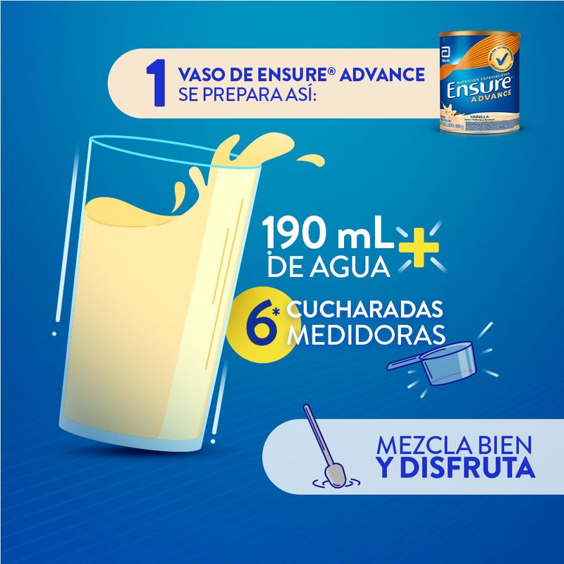 Ensure® Advance es ideal para adultos que requieran mantener o recuperar su masa muscular perdida por una condición de salud, y volver a llevar un estilo de vida activo. Formulado con CaHMB y proteína para los músculos, así como 28 vitaminas y minerales, incluyendo calcio y vitamina D, que apoyan la vitalidad fuerza y energía. También contiene omega 3 y 6 y no contiene grasas trans.