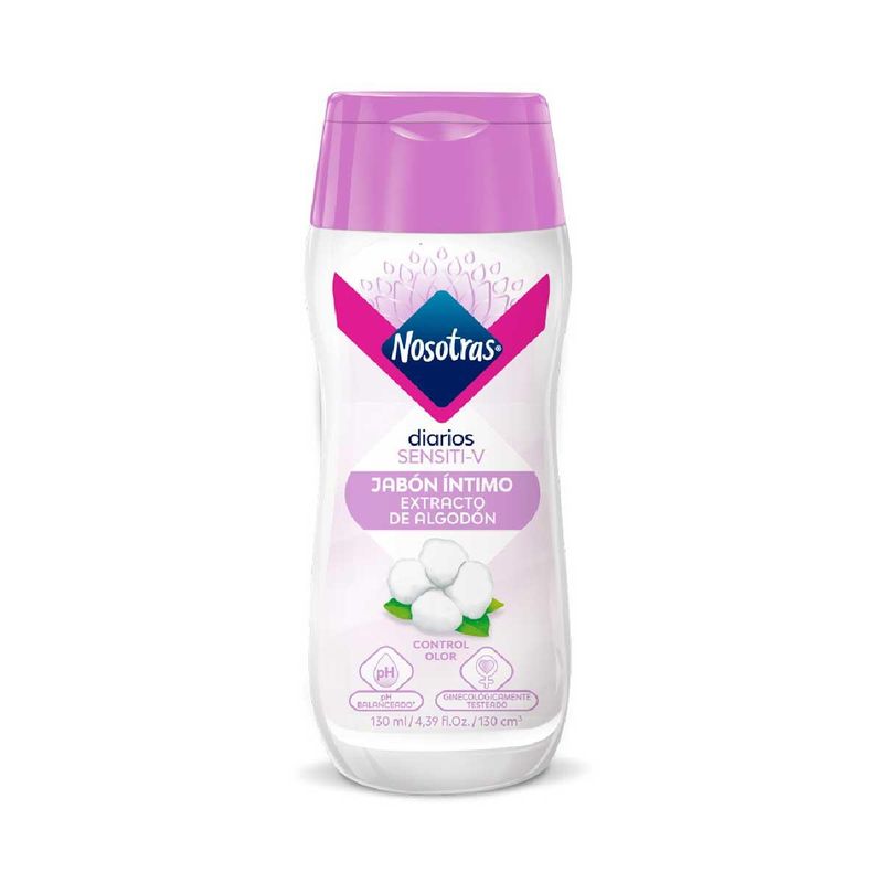 El frasco contiene 130 ml de Jabón Íntimo Nosotras Sensiti-V, un producto diseñado especialmente para el cuidado delicado de la zona íntima de la mujer. Este jabón suave y especializado ayuda a mantener el equilibrio natural del pH, proporcionando una limpieza suave y frescura durante todo el día. Nosotras Sensiti-V es la elección perfecta para mantener la higiene íntima y prevenir posibles molestias. Confía en este jabón para cuidar y proteger tu zona íntima.