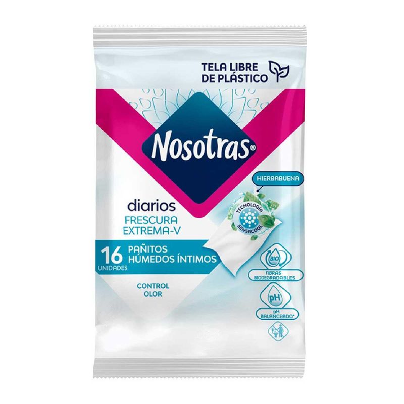 Experimenta la frescura extrema con los Pañitos Húmedos Íntimos Nosotras, presentados en un paquete con 16 unidades. Estos pañitos están diseñados especialmente para proporcionar una sensación refrescante y limpieza suave en las zonas íntimas. Su tamaño compacto los hace ideales para llevar en tu bolso y utilizar en cualquier momento del día. Asegura una sensación de frescura duradera con Nosotras Frescura Extrema.