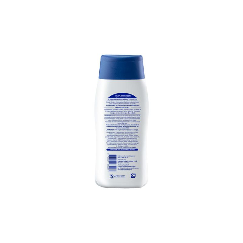 Este es un producto cosmético, no posee acciones terapéuticas. El Shampoo Keratin2 María Salomé® repara la fibra capilar de los daños causados por tratamientos químicos (tintura, alisado o decoloración). Mantiene en buen estado el cuero cabelludo y disminuye la caída del cabello. *Acción anticaída por causas no asociadas a enfermedades.