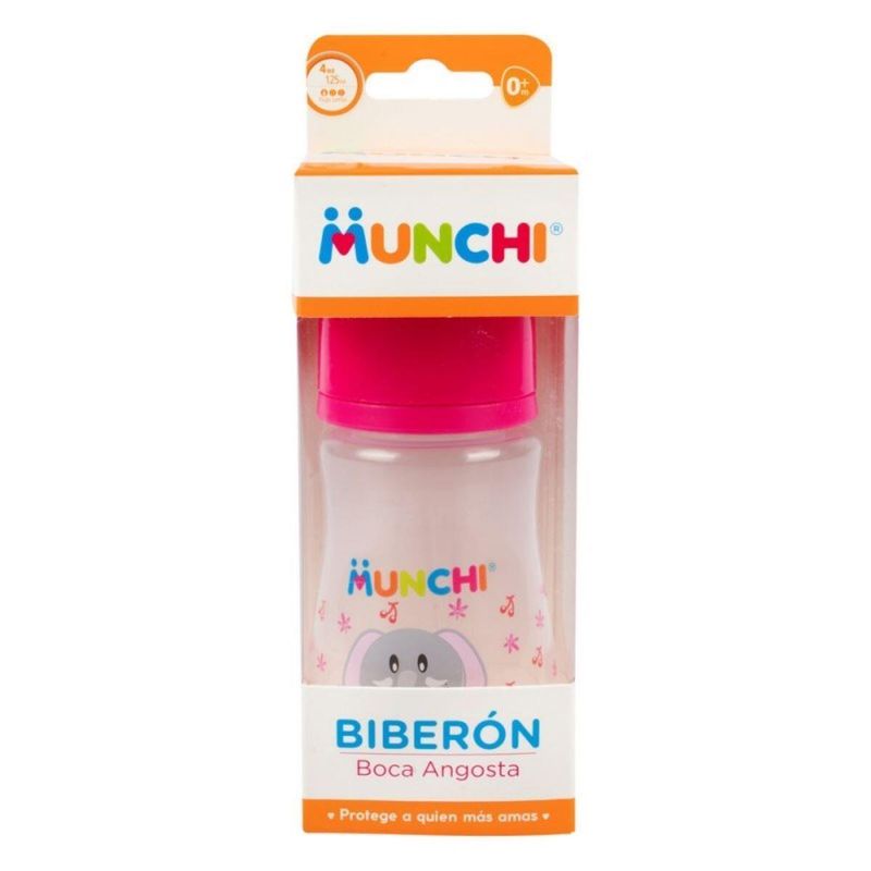 Tetero Munchi Decorado x 4 Onzas con diseno anatómico que permite que el bebé lo sujete con facilidad. Tapa protectora que evita derrames durante los viajes y su almacenamiento. Diseñado para llenar y lavar fácilmente. Escala en onzas y mililitros para medir y controlar la cantidad de alimento. Capacidad de 4 oz (125 ml). Chupo 100% silicona. Chupo de flujo lento. Libre de bisfenol a (BPA).